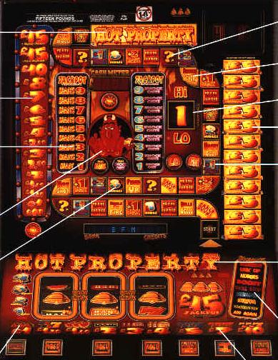 ![]() ![]() ![]() Hot Property is a trail game. You must fill the "Hot Property" word to start the feature. Win above the winline - if flashed, and all reels held, win steps onto winline. Also works for wins below the winline. The hilo sometimes hints which way to gamble for a guaranteed win. The Hells Bells feature (near the bottom of the feature trail) is a guaranteed jackpot! The Bonuses can be activated when you either spin in the "Bonus Symbol" on the middle reel or when you land on a bonus square on the feature game. Various things can be slowed down with the cancel button. Occasionally you will get a skill stop (cancel slow this down). The bonuses you can get on the reel game are also available in the feature game. Getting the "Hot Property" symbol on the reels has the same effect as reaching the top of the feature trail! When on the feature you can sometimes hold a win that spins in, dont forget to remember tat te feature game is a normal reel game as well! If you land on the ? while on the feature. If you are unlucky enough to get "You're Fired" you can play the feature again by pressing the start button before the feature trail light get back to the start. Off you go again up the feature trail.